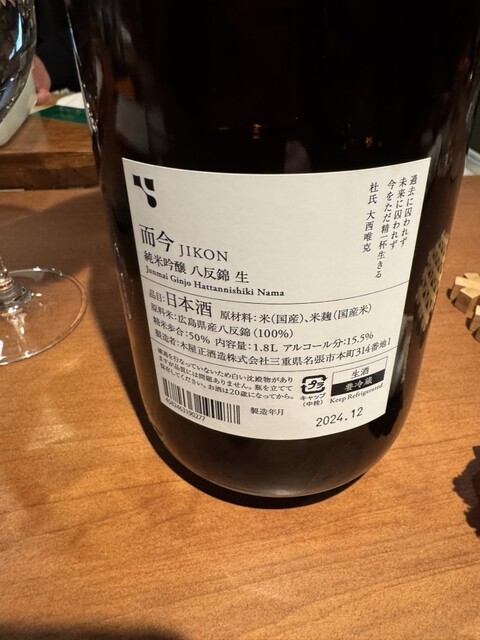 お造り盛り合わせお造り盛り合わせ5点盛(平目、九絵、〆鯖、鰤、皮ハギの肝和え); 合鴨と赤茄子のはさみ焼き; 土鍋飯(牡蠣松前焼・せり); 鮪ほほ肉と下仁田葱のねぎま; 林檎・ジャズミンサワー;日本酒グラス3種類(而今、宮泉、磯自慢)
