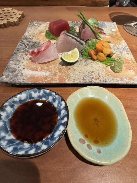 お造り盛り合わせ5点盛(平目、九絵、〆鯖、鰤、皮ハギの肝和え)