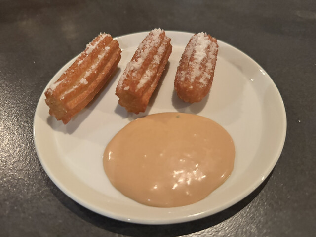 感想: シェフはパティシエ出身なだけあり、手製チュロスは申し分無し。外はサクサク、中はホクホクと甘いデュルセ•デ・レチェ(南米風キャラメルソース)に浸しながら食べて美味い限り。