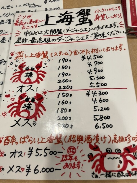 ここひ、業者を通さないで直に上海蟹を仕入れていて、沢山の蟹の中から蟹を選ばして貰い気分も上がりました。