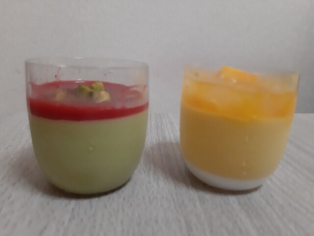 苺ソースとピスタチオのプリン450円、宮崎県産完熟マンゴープリン500円