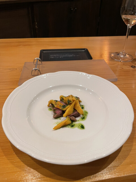 シェフの丁寧な下拵えによって臭みが一切なくなったホヤの炒め物。人生で一番美味しいホヤの食べ方をしました。白ワインとのマリアージュが抜群な一品。