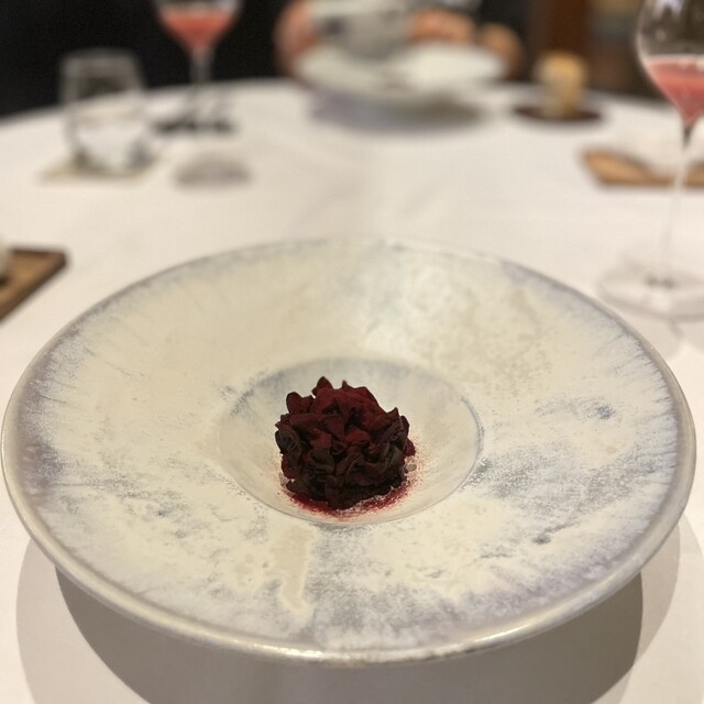 長野パープルの芯の部分もドーム上に仕上げた見た目も可愛い一皿。ストラチャテッラチーズ入り。焼いた茄子や発酵した茄子、クローブ(スパイス)の香りが混ざった複雑な香りを楽しむお料理でした。