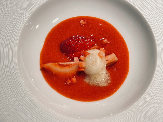 蒸した苺にさらに生の苺を合わせたソルベ. 酸味と甘さのバランスが最高.