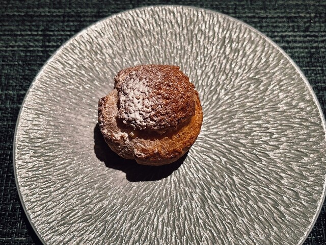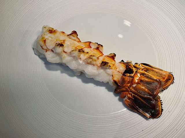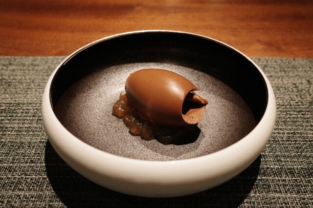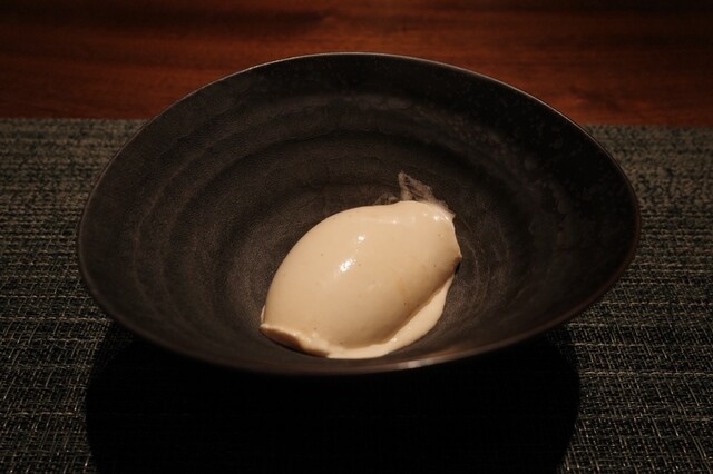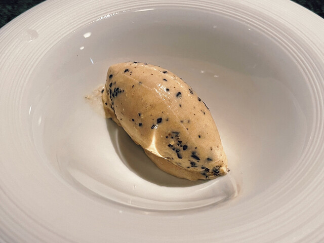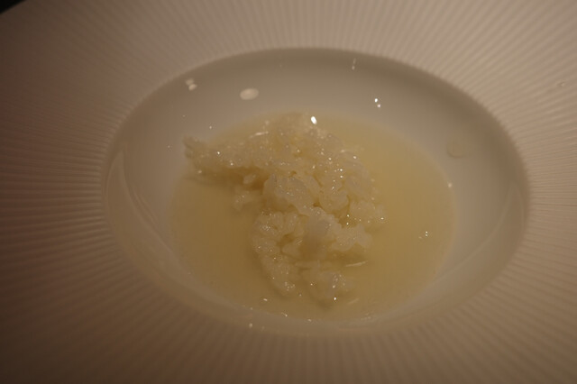 皮がパリパリ、火入れが絶妙、レモングラスを使った藁焼きの香りは優しく…半生の身から豊かな旨みがあふれ出す…甘酒のヴィネグレットリースの甘みと酸味のバランスが良く…黒睦の淡白な味わいがソース重層的な味わいによく絡み…口の中で一体感が生まれる…ほどよい濃縮感で余韻が良い