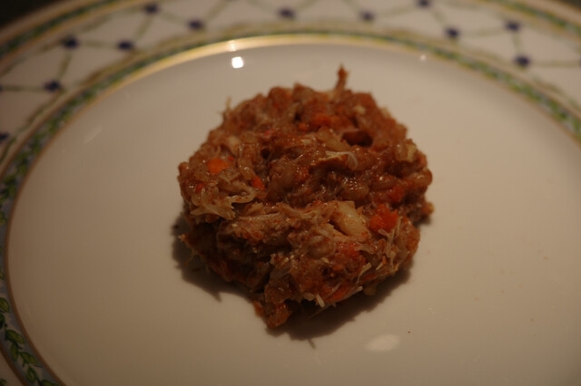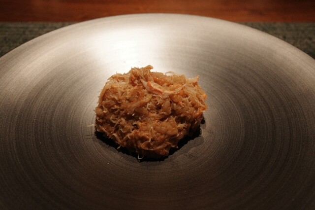 一合のご飯に1.6キロの毛蟹を2匹使用、殻と蟹味噌を使った出汁でリゾット…塩は使用していないとのことですが、蟹の塩気と旨みがしっかりと感じられます…旨味を堪能