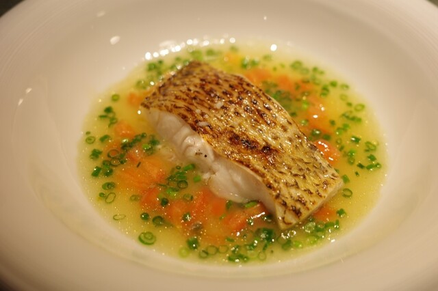 レモングラスを使った藁焼きの香りは優しく…半生の身から豊かな旨みがあふれ出す…レモングラスを使った藁焼きの香りは優しく…甘酒のヴィネグレットリースの甘みと酸味のバランスが良く…伊佐木の淡白な味わいがソース重層的な味わいによく絡み…口の中で一体感が生まれる…ほどよい濃縮感で余韻が良い