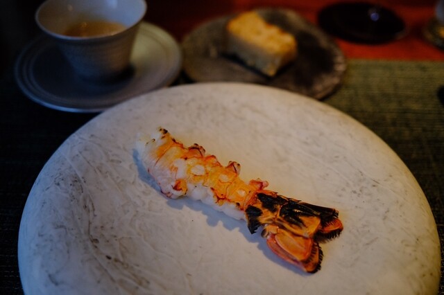 定番ですがいつも感動がある、自分が一番好きな素晴らしい一品…赤座海老は炭火焼きにしており、ぷりっとした弾力と強い旨みを感じます…ビスクは海老の殻と足、野菜、白神山地の軟水を用い6時間茹でて旨味を濃縮、海老そのままは美味しい、ビスクは海老につけても美味しい