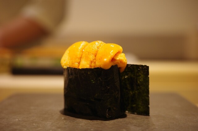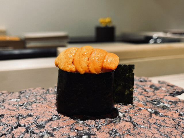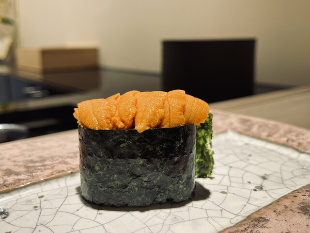 濃厚なコクと甘さで舌に絡む…雲丹のとろっとした口当たりとバリバリっとした海苔のコントラストが際立つ美味しさ…食べると口が幸せでいっぱいに
