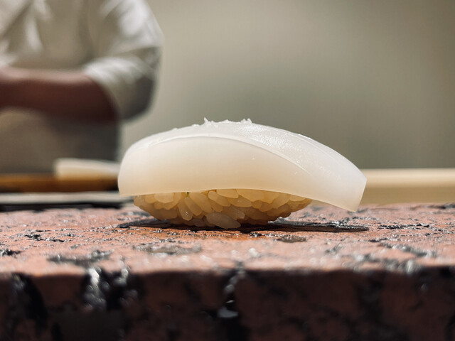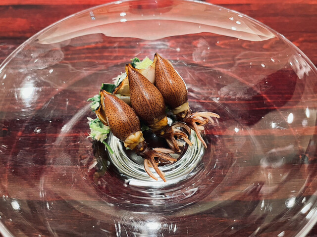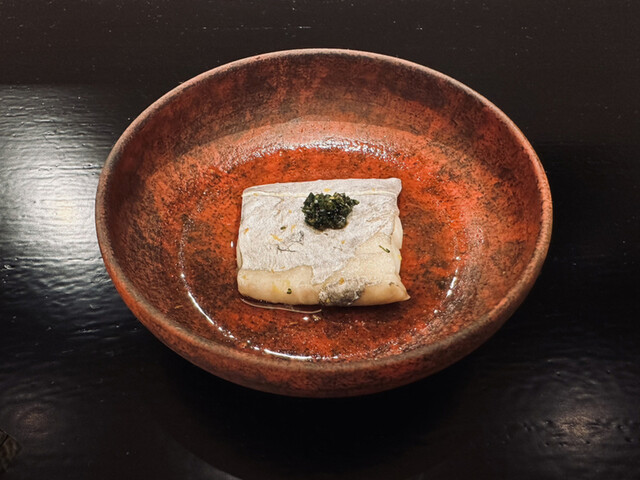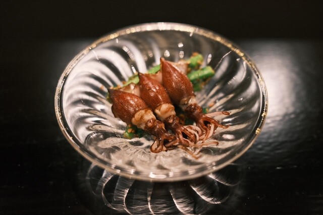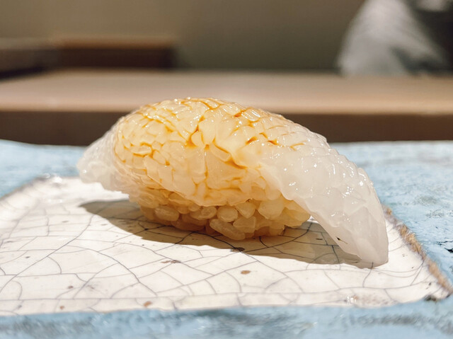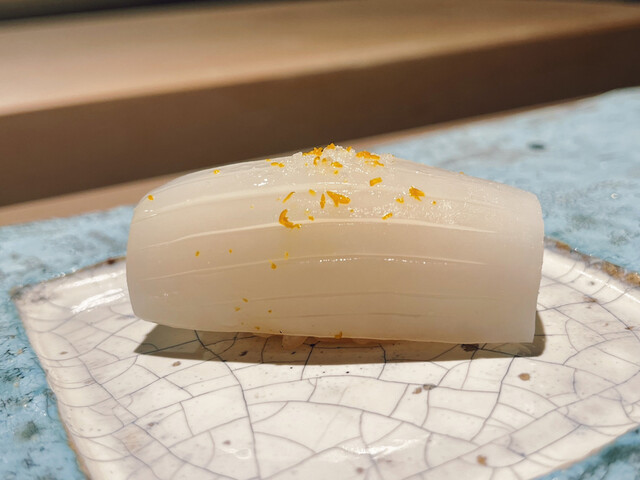 凄い包丁を入れることで…イカ繊細な甘みと鼻に抜けるしその香りが相性抜群…ねっとりとして舌にまとわりつく食感で忘れられない