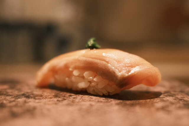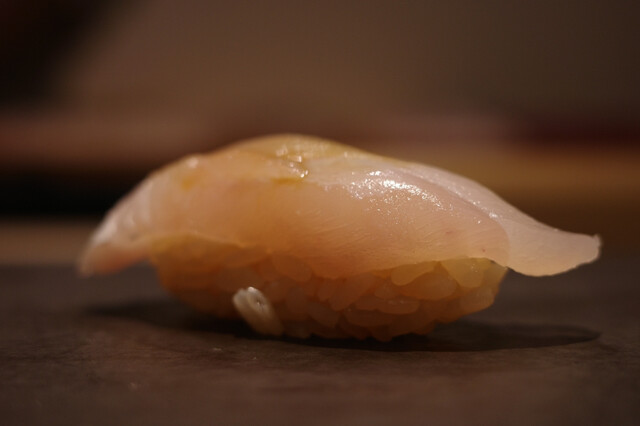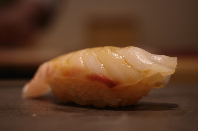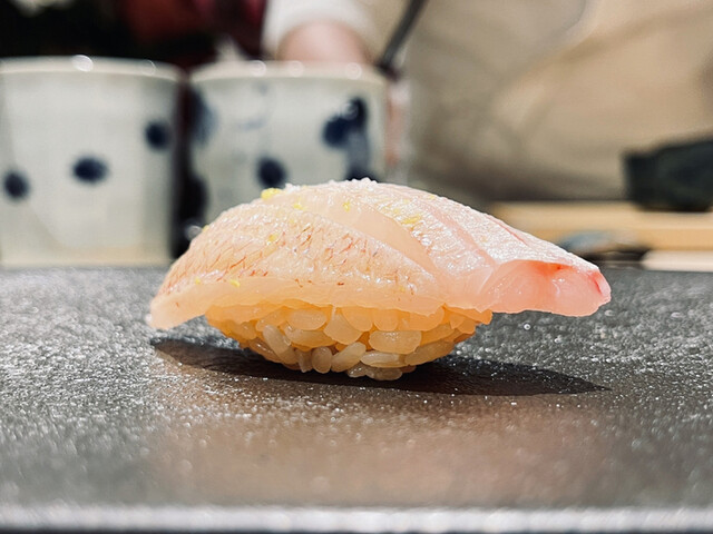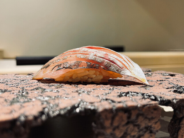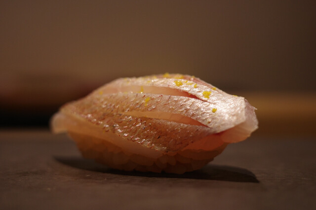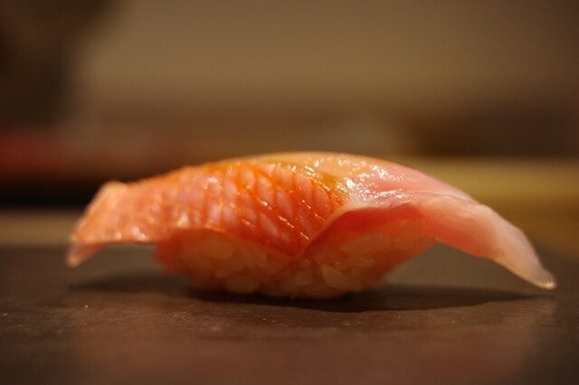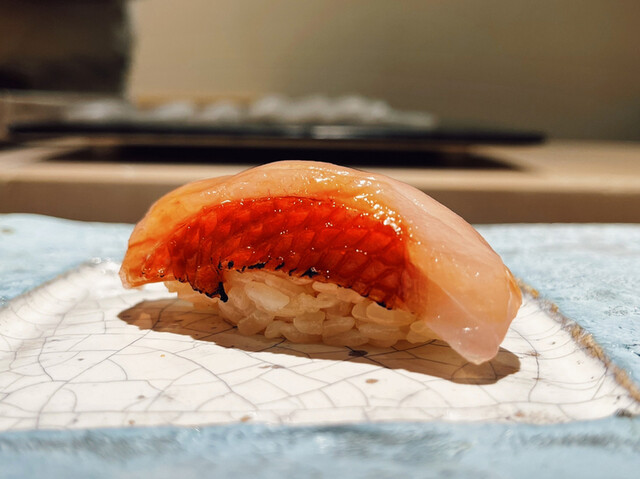 松皮にした金目鯛はとても綺麗な…皮がもちもち身が柔らかく…ふわりと昆布の香りで…酢シャリとの馴染みも抜群に良い