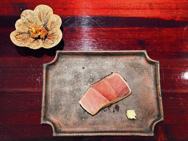 ❹新潟県佐渡島迷い鰹のたたき、ネギと生姜醤油