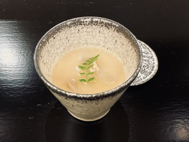 ❶島根県松葉蟹の茶碗蒸し、百合根、豆蛤の出汁