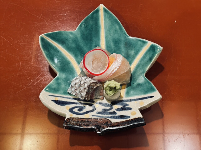 ④お造り スズキ(皮を炙ってあります)、醬油