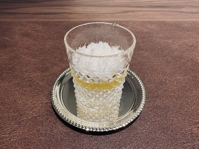 お口直しのさっぱり柚子シャーベット、甘みが少なく、酸味が強い、みずみずしくて、氷に近い食感で、口に含んだ時の一瞬の涼感をさそうインパクトが心地よい