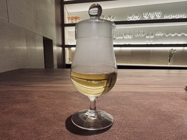 スモークが詰まったガラスの覆いを乗せて、藁の香りを閉じ込めた、テーブルまで運びます、目の前で覆いを取るので、スモーキーな燻製の香りが漂う、苦みが少なく、まろやかでほろりと香ばしい“飲む燻製”ほうじ茶の味わい