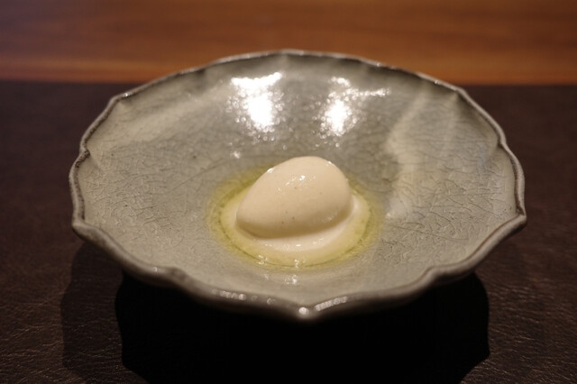 ❼ 愛媛県産中山栗のフラン/滋賀県産米のピューレ/蒸して裏ごしした栗/トリュフとメープルのオイル