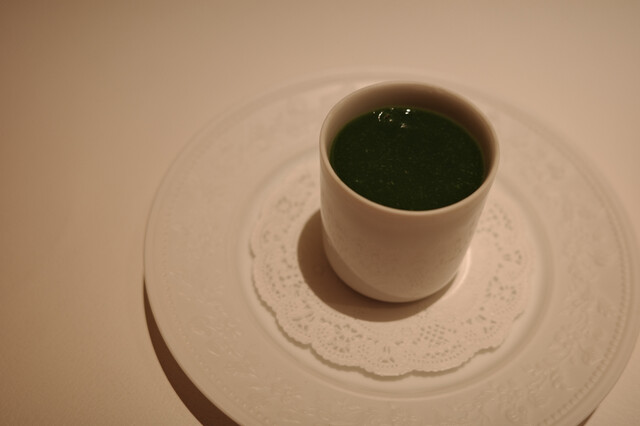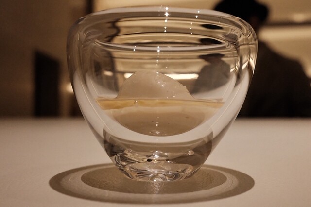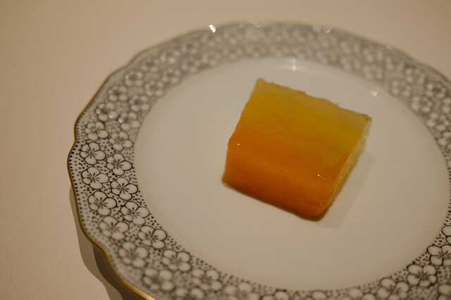 貴重なものなようで入手困難で買えずでした、バジルのブランマンジェ、珊瑚樹トマトのコンソメのグラニテとジュレ、天草のオリーブオイル、金箔…トマトの旨味を凝縮したジュレ、一口味わうと、まさにカプレーゼ…驚きと発見の連続です…不思議な美味しさ