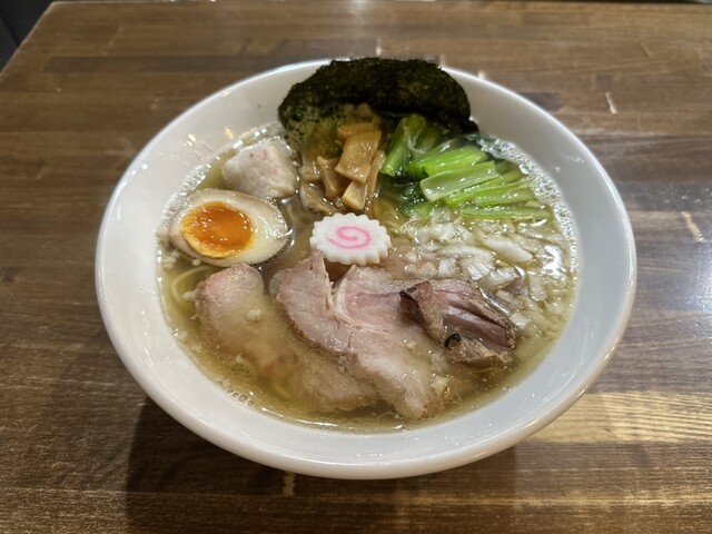 いい具合の塩味、細麺、鶏チャーシュー、豚チャーシュー、煮卵、岩のり、わかめ、たっぷりの浅利とベビー帆立、コーン、