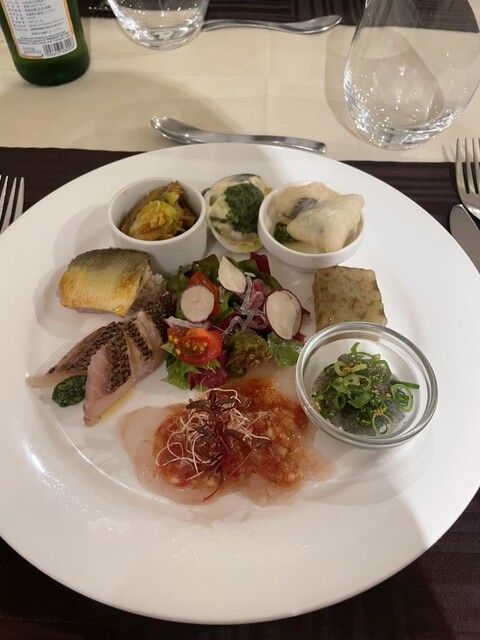 ランチで何回か伺ったことがあり、その時からお気に入りでしたが、前菜は一つ一つが丁寧に作られていました。特に平目のマリネとハマグリの香草バター焼きが好きでした。