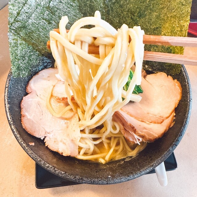 麺は家系ラーメンらしく中太麺になっており、パツッとした硬さが特徴です。この硬さと弾力がたもりませんね。麺の旨みも良く感じます。