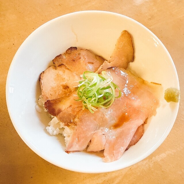 ラーメンにも乗っていたチャーシューを乗せたご飯です。ねぎが添えられています。ご飯に合わないわけないですよね。また、卓上のレインボーペッパーをかけると、美味さ倍増です。爽やかな辛みがいいですね。