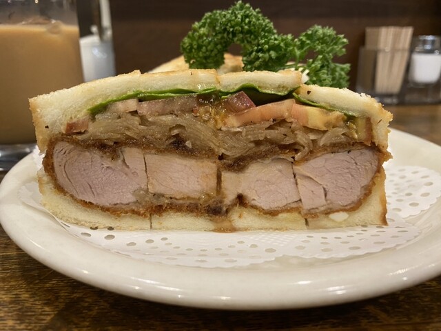 タマネギ、トマト、サラダ菜入りのカツサンド
