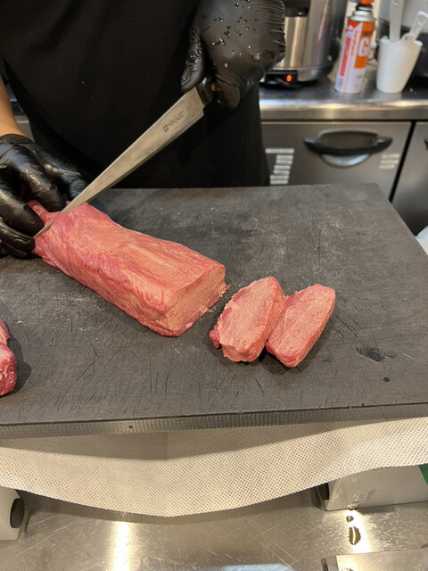 カウンター席では目の前で綺麗大きな肉の塊を食べ易く、丁寧に切ってくれる演出が見られます!!