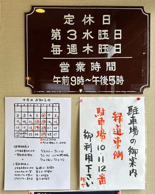 店先に2〜3台縦列で停めれますが、店の東側(道路の向こう側)に駐車場があるので、そっちの方が停めやすいです