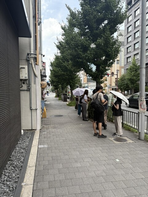5組10人待ちでしたが、外の歩道で並びだしました。今日も猛烈に暑つかったのですが、貝だしラーメンのために耐えました。店内は11席(うち、2掛けテーブルが2つであとはカウンター。)