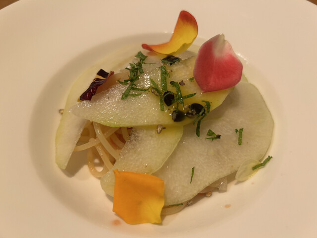 →「長野県産洋梨に食用薔薇と青紫蘇が振り撒かれ 冷製パスタ(30g)」