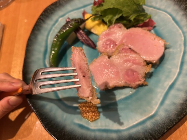 → 「栃木県産豚肉を使ったカツレツ。付け合わせは、山梨県産葉野菜、シシトウ、コリンキーカボチャ、ヤーコン、ルバーブ」