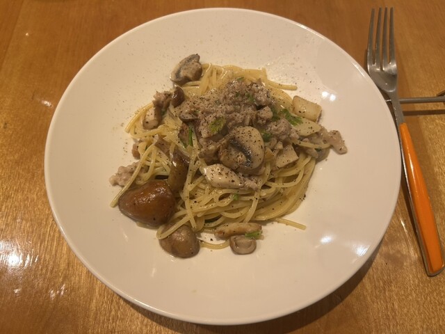 →「キノコ(丹波しめじ、なめこ、ポルチーニ、マッシュルーム)とサルシッチャのクリームパスタ」