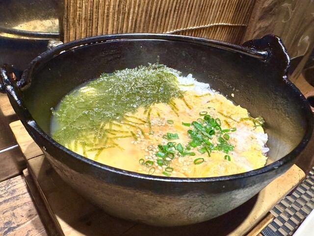 〆に〝鶏雑炊〟を。優しい鶏出汁が胃袋を労わるようです。我ながらナイスなチョイス