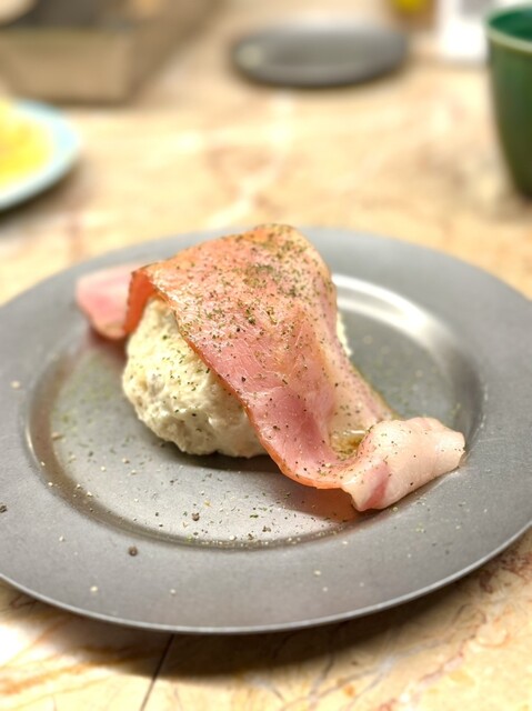 〝ポテトサラダ〟はベーコンがドーン。普段食べている大衆酒場のポテサラとは違う…。ポテトが滑らかで上品ながら、味がしっかりついていて美味しいです!
