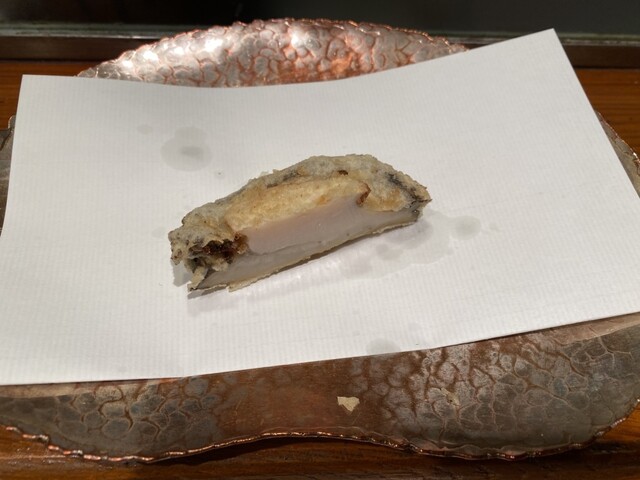 お店はJR北新地から地上にあがってすぐのビルにあります。コースで頂きますがカニの冷製茶碗蒸し、もずく酢から始まり、エビ、アワビ、アスパラ、人参‥とテンポよくマスターが揚げて下さいます。写真はその一部ですが全てがサクサクで衣はカラッと中ジューシー。中でもフカヒレの天ぷら、タルトのように仕上がったさつまいもの天ぷらは、この店にしかない仕上がりの一品でした。