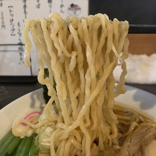 麺の上に乗った薄切りで大きめチャーシューが柔らかくて美味しい。