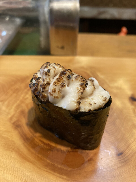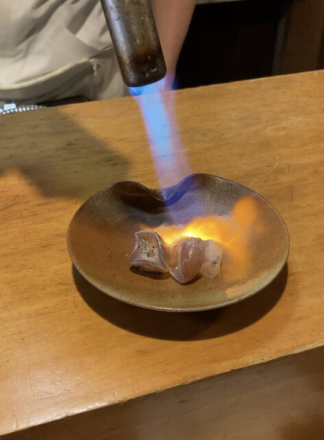 途中で、サービス2品目の生タコの炙りがでてきました!まだ動いているタコの吸盤を目の前で炙って下さります。サービス精神旺盛な所が、またまたにくい所ですね。