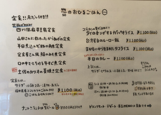 JR鯖江駅前のロータリーにあるお店『惣so』さん。メニューはどれも自家製にこだわっておられます。