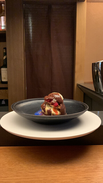 いちごのリキュールをかけられるとチョコレートの球が溶け出して、ピスタチオや大葉、いちご、フランボワーズが入っておりとても美味しかったです。
