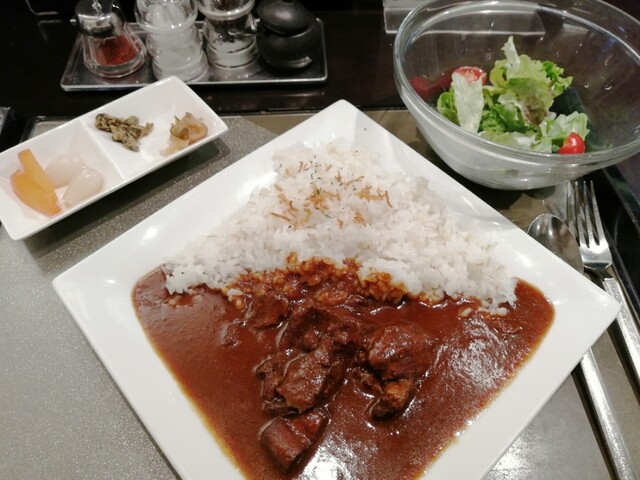 味の方はというと、これまたなかなかイケてます。サラダのドレッシングがなかなか絶妙で、濃すぎず薄すぎずの、好みど真ん中の味付けでした。牛タンカレーもとても美味しく、よく煮込んである牛タンの食感は筆舌に尽くしがたいおいしさ。味もしっかり目なので、ご飯のおかわりもしやすいです。値段は1300円と少し高めではありますが、おかわりができるので満腹感には事欠かないと思います。