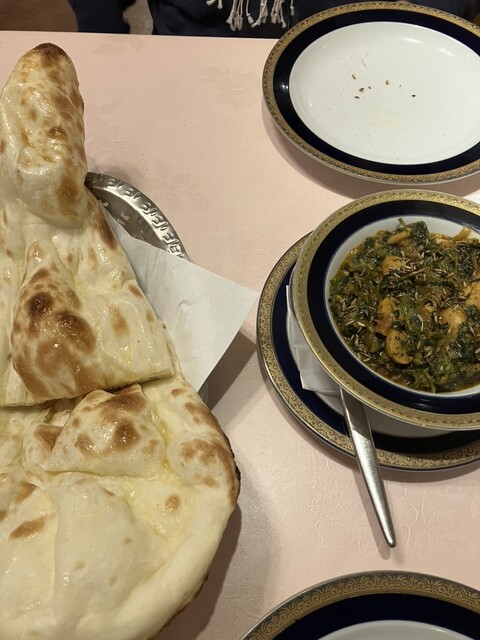 カレーはマトンシャヒマサラとマッシュルームとほうれん草のカレーにナン。
