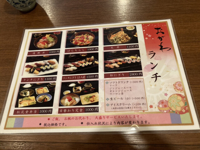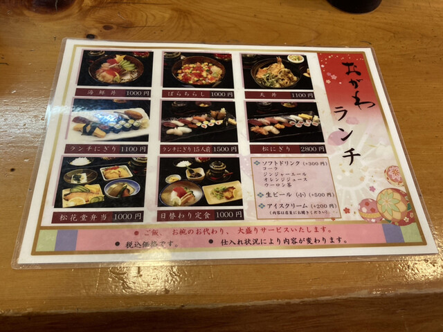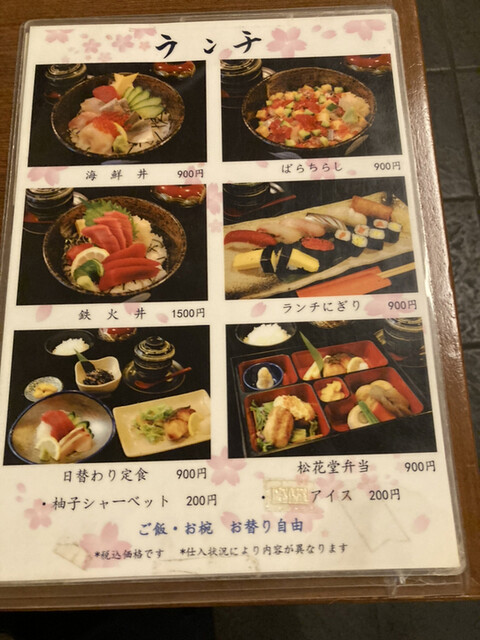 メニューの日替わり定食と松花堂弁当の違いは刺身が煮物に変わるだけで焼魚は同じとのことです。生魚が苦手な人はお寿司屋さんに行かないと思いますが、お寿司屋さんの料理も好きという方にはいいと思います。