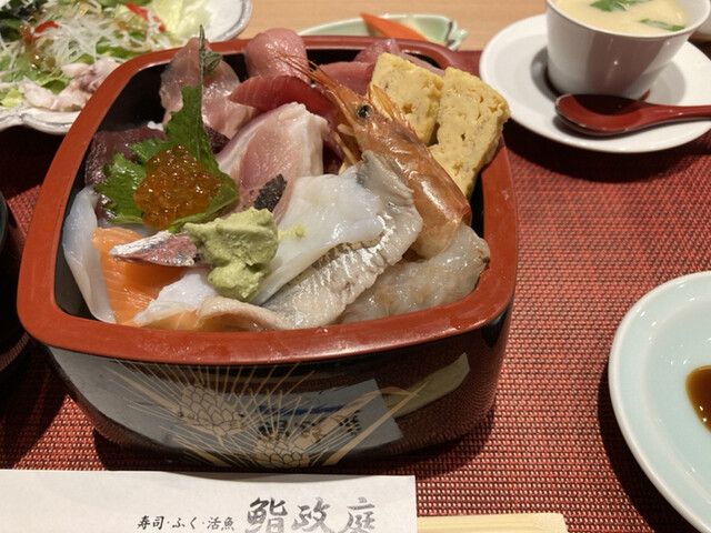 前回中とろ丼を食べたので、今回はちらし丼にしました。サラダ•茶碗蒸しも頼みました。