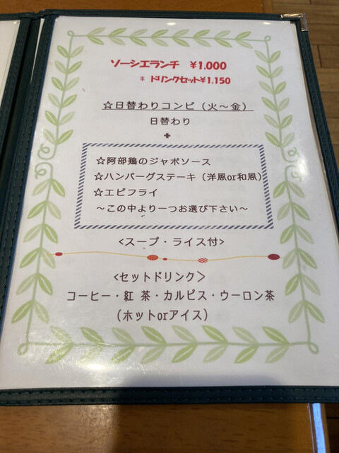 メニューを見て阿部鶏のジャポソースとハンバーグのセットにしました。ハンバーグは洋風のソースにしました。この日の日替わりはイカフライでした。