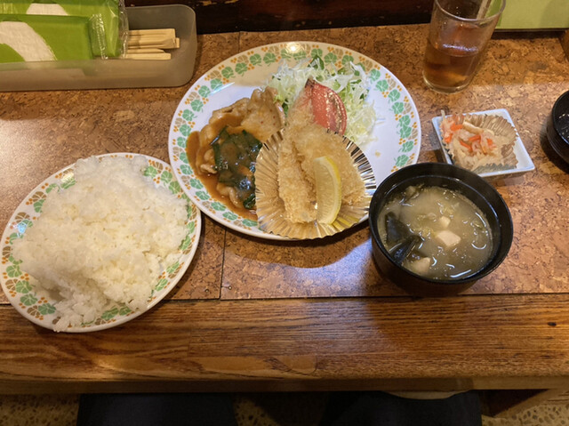 外メニューで日替わりが豚ロース肉の和風ソテー、アジ•帆立貝柱フライ盛り合わせでしたので、そちらを注文しました。
