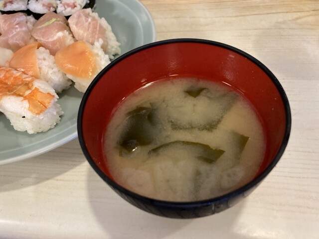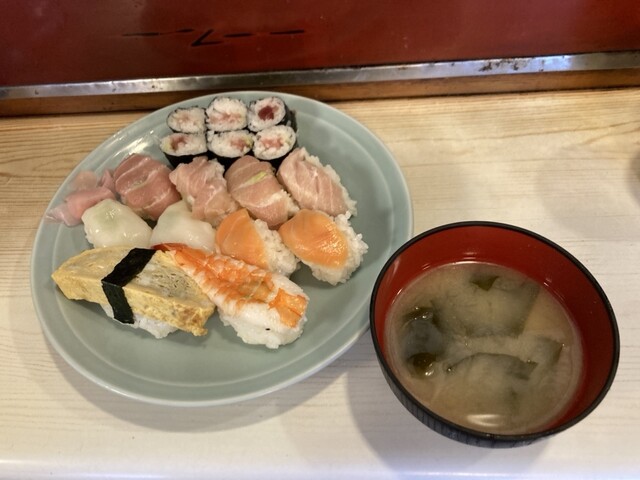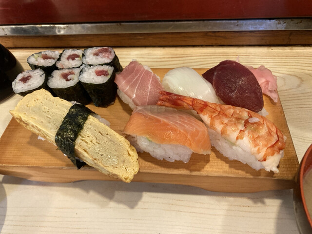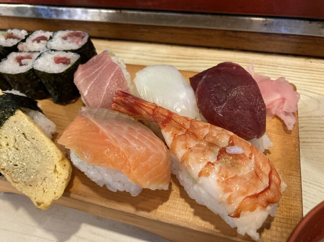 にぎりはまぐろ、イカ、サーモン、エビ、卵でした。