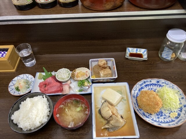 20分くらいで刺身定食ぽい感じで揃いました。その後、コロッケ、銀ダラ煮付けと出てきました。