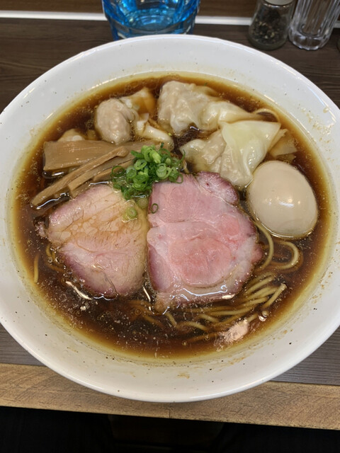 トッピングは吊るし焼きの肩ロース×2、ワンタン×4、味玉、メンマ、青葱。