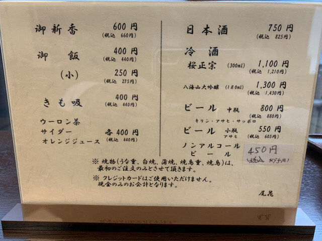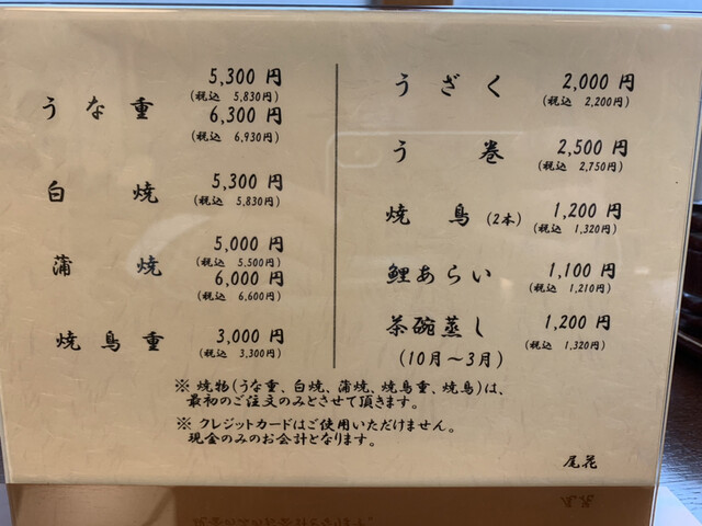今回は、「鰻重 6930円」と「きも吸い 440円」と「焼鳥 1320円」を注文。